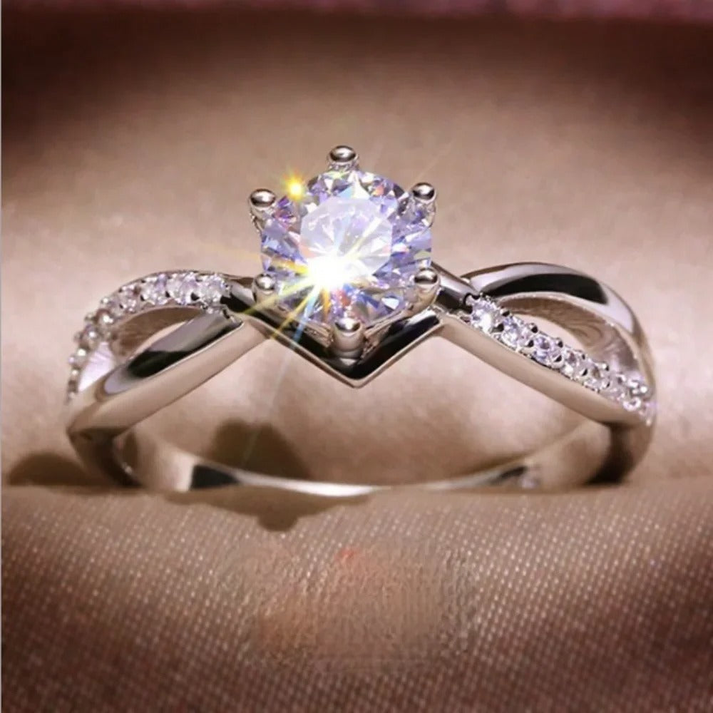 Unterstützen Sie Ihr Engagement mit diesem schillernden Wavy Twist Verlobungsring - ein Symbol für ewige Liebe und moderne Eleganz. Das elegante, verschlungene Design mit schimmernden runden Edelsteinen fängt den Tanz eines lebenslangen Versprechens ein. Steigern Sie Ihre Verlobung mit zeitloser Schönheit, die Bände spricht und für diejenigen geschaffen wurde, die an die außergewöhnliche Reise der Liebe glauben.