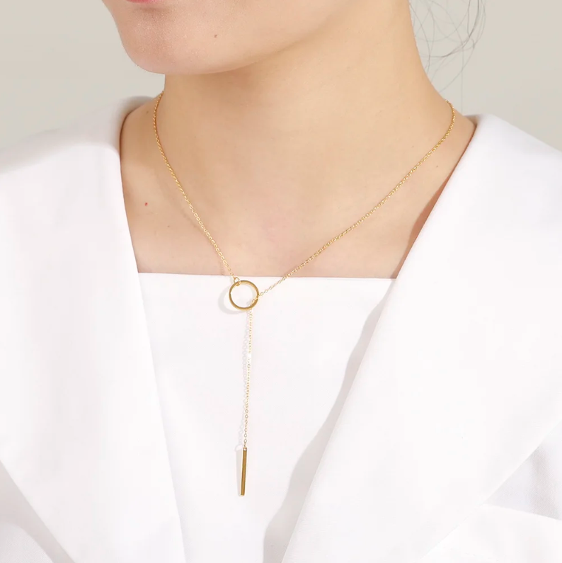 Strahlen Sie Eleganz und Raffinesse aus mit unserem zarten Schlüsselbein-Anhänger - ein Accessoire, das mühelos Eloquenz ausstrahlt. Mit einer subtilen und fein gearbeiteten Kette, die sich elegant über das Schlüsselbein legt, verleiht diese Halskette jedem Ensemble einen Hauch von Raffinesse. Im Mittelpunkt steht ein schicker runder Barren-Anhänger, der sich als vielseitiger Akzent sowohl für legere als auch für formelle Anlässe eignet.