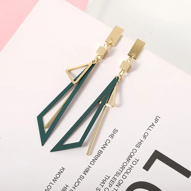 Mit unseren unverwechselbaren geometrischen Ohrringen, bei denen jede Linie ihre eigene Geschichte erzählt, können Sie die Kunst des kühnen Ausdrucks genießen. Diese Ohrringe bestechen durch ihre markanten dreieckigen Formen, die sich mit Eleganz wiegen und eine bezaubernde Silhouette bilden. Die länglichen Tropfen schmücken nicht nur den Hals, sondern umrahmen auch Ihr Gesicht mit einer modernen Ausstrahlung und verleihen Ihrem Ensemble einen Hauch von modernem Glamour.