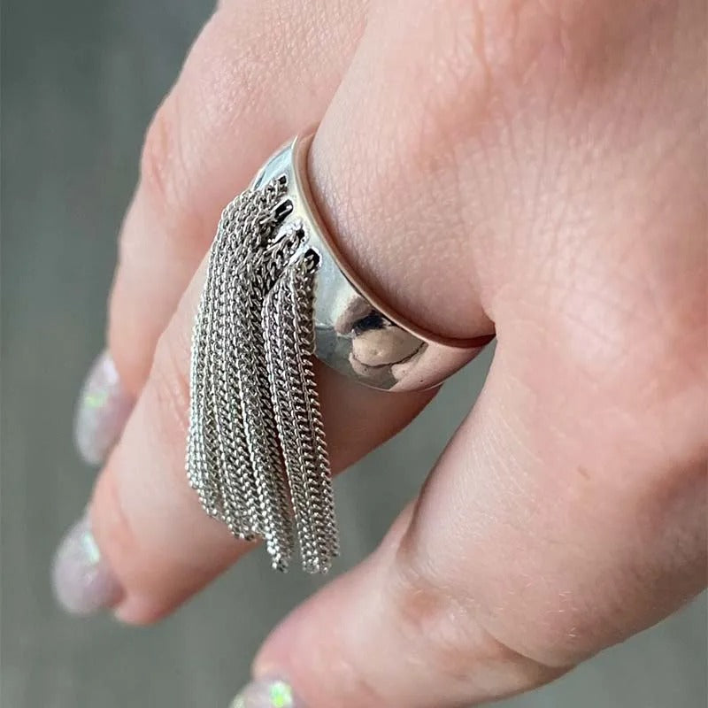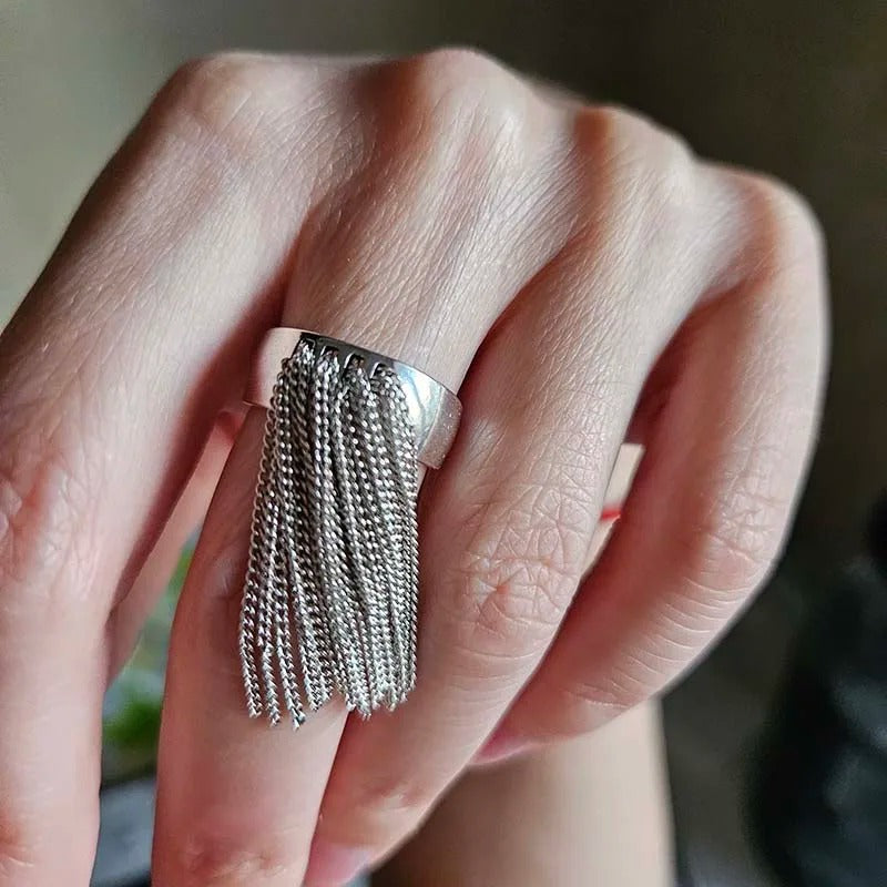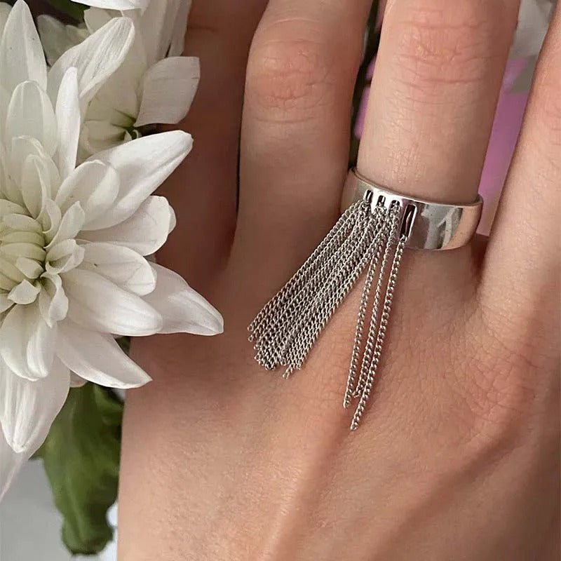 Unser Kettenring aus Sterlingsilber mit einem zierlichen Quastenring im Punk-Look wird Ihrem Look Eleganz verleihen. Dieses schicke und moderne Statement-Stück wird Ihr Modespiel mühelos aufwerten. Der aus Sterlingsilber gefertigte Ring verleiht jedem Ensemble mit seinen einzigartigen Quasten Raffinesse. Das trendige Kettendetail bietet einen verspielten und doch raffinierten Reiz und ist perfekt für alle, die eine Mischung aus Charme und Kühnheit in ihren Accessoires suchen.