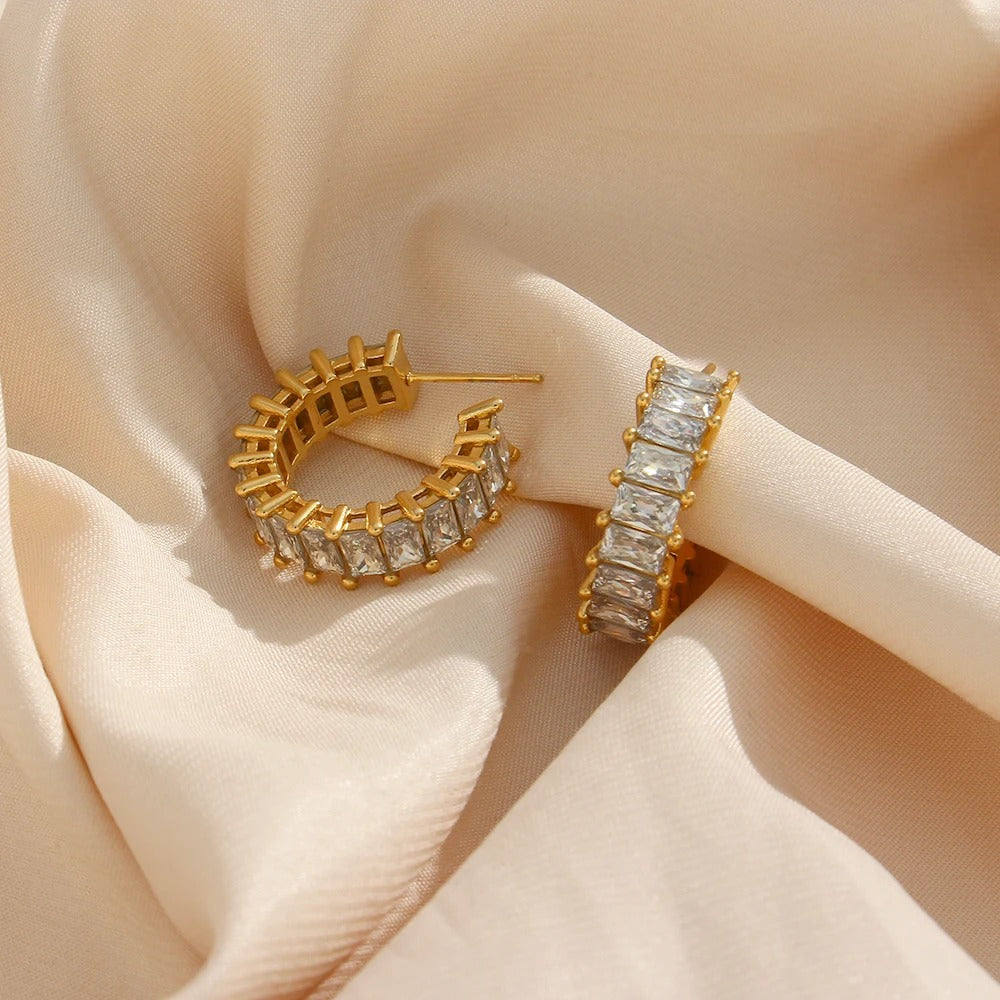 Entdecken Sie das Vergnügen, eine absolut unverwechselbare Kreation zu besitzen, die nicht nur Ihren persönlichen Stil unterstreicht, sondern auch Ihre raffinierte Sensibilität zum Ausdruck bringt. Jeder Ohrring präsentiert einen makellosen Zirkon, der zu einem schlanken Rechteck geformt ist und Ihrem Ensemble einen Hauch von Raffinesse verleiht. Die komplizierten Pave-Stein-Details auf dem Edelstahlring verleihen eine unverwechselbare Textur und machen diese Ohrringe zu einem herausragenden Akzentstück, das nahtlos vom Tag zum Abend übergeht.