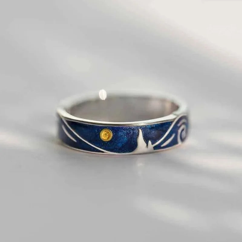 Unsere Glitzernder Sternenring sind die idealen Begleiter für den eleganten Abend und den zauberhaften Alltag. Inspiriert von der ewigen Anziehungskraft von Van Goghs Sternennacht, sind diese Ringe mehr als bloße Accessoires und verwandeln sich in tragbare Meisterwerke. Lassen Sie die Pracht des Kosmos an Ihren Fingern erstrahlen und sorgen Sie mit jeder Ihrer Gesten für Gesprächsstoff und Begeisterung.