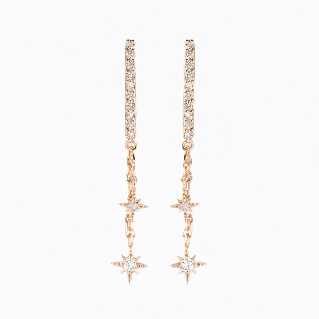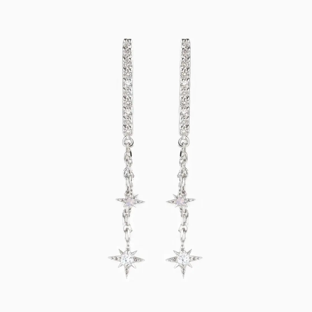 Erhellen Sie Ihren Stil mit himmlischer Anziehungskraft, indem Sie sich von der Brillanz dieser Ohrringe verzaubern lassen. Jedes Stück ist mit exquisiten Zirkonia-Steinen besetzt und strahlt ein schillerndes Funkeln aus, das an Himmelskörper erinnert. Diese Ohrringe, die an die Erhabenheit des Kosmos erinnern, strahlen einen luxuriösen und glamourösen Charme aus. Mit ihrem modernen Reifendesign bieten sie eine Vielseitigkeit, die jedes Ensemble mühelos aufwertet und sie zu einem zeitlosen Bestandteil Ihrer Schmucksammlung macht.