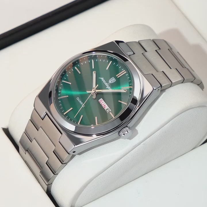 Eine stilvolle Herrenarmbanduhr mit präzisem Quarzwerk. Vereint Funktionalität und Eleganz, perfekt sowohl für den Alltag als auch für formelle Anlässe.