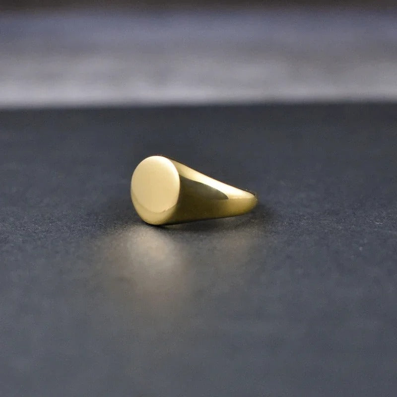 Unser Siegelring ist zeitlos elegant und zeugt von beständigem Stil. Der aus hochwertigem Edelstahl gefertigte Ring zeichnet sich durch eine unvergleichliche Langlebigkeit aus, die dafür sorgt, dass er über Jahre hinweg ein geschätztes Stück in Ihrer Sammlung bleibt. Sein raffiniertes Design, das durch eine glänzende Vergoldung akzentuiert wird, strahlt Luxus und Raffinesse aus, während seine blanke Oberfläche zur Personalisierung einlädt und es Ihnen ermöglicht, ihn zu einem einzigartigen Stück zu machen. Lassen Sie diesen Ring ein Symbol Ihres tadellosen Geschmacks und Ihres unerschütterlichen Selbstbewusstseins sein, das mit seiner zeitlosen Anziehungskraft flüchtige Trends überdauert.